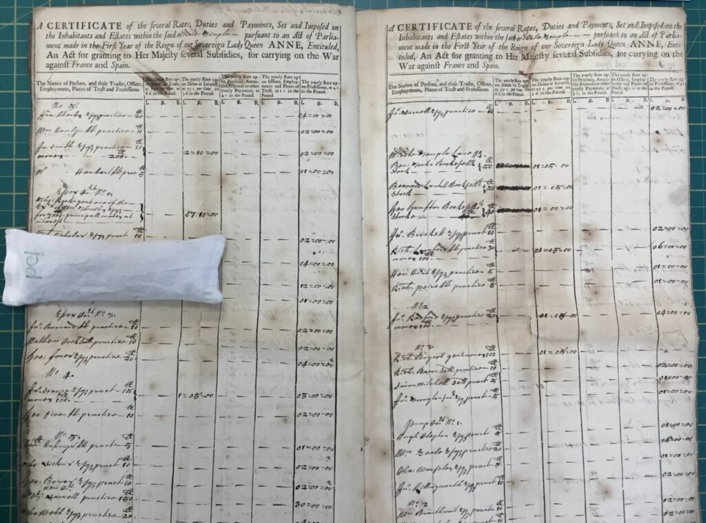 Another unique item on display was MT/2/XRR/36, a ‘certificate of money charged for continuing the war against France and Spain,’ dated 1703. The certificate lists the name, profession and address of each chamber occupant at the Inn, and the yearly rate charged on them to assist the War of the Spanish Succession. The ‘Act for granting to Her Majesty several Subsidies for carrying on the War against France and Spain’ was passed in February 1703 (new style) to raise funds for the war. The Middle Temple certificate was compiled on Sunday, 25 March 1703 by the Inn’s assessors, who were the butlers, Thomas Silvester and Jonathan Pennyfather, and approved by Senior Benchers: Edward Northey, John Entwisle, Martin Ryder, Thomas Lake, William Cherrey and Joseph Offley.