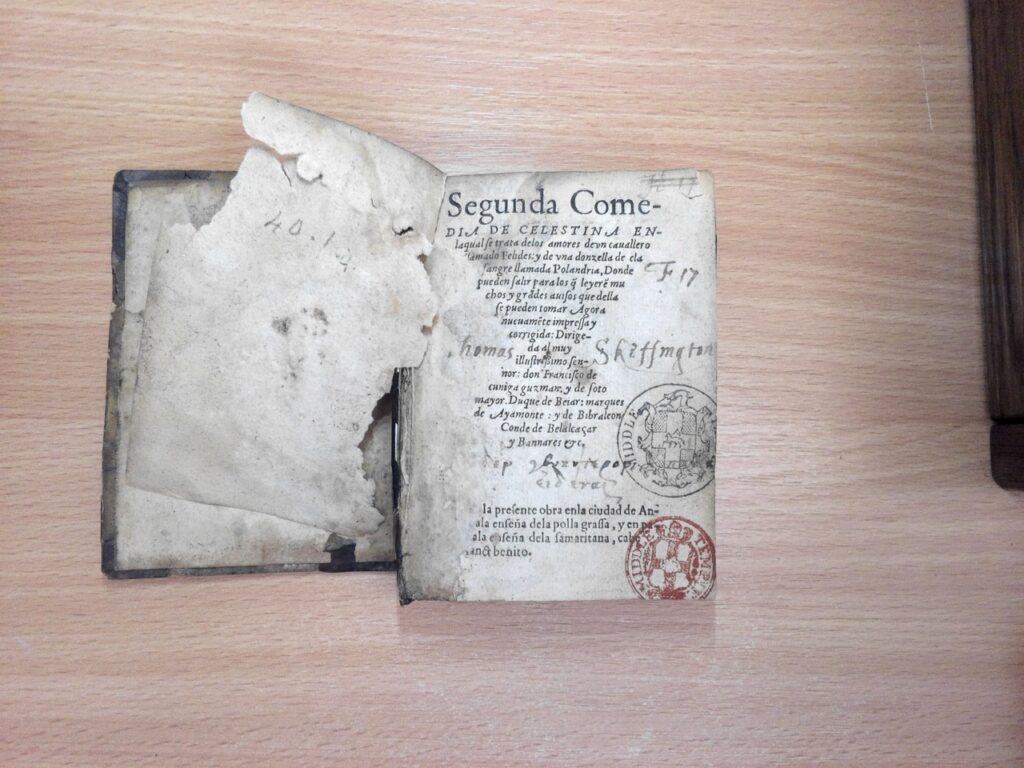 The exhibition and accompanying events demonstrate the importance of the Middle Temple Library’s rich, rare book collection and the value of working collaboratively with research audiences outside of the Inn. The exhibition also highlighted that three of the books featured are in dire need of restoration, the cost of which can be sponsored by interested members. Lucas Gracián Dantisco’s handbook of manners, Galateo Español (Valladolid, 1603) is a small book measuring 14cm which would cost £400 to repair. Diego de Yepes’ Historia Particular de la Persecucion de Inglaterra, y de los martirios mas insignes que en ella a avido (Madrid, 1599) is in dire need of repair, and would cost £800 to do so. Feliciano de Silva’s Segunda Comedia de Celestina (Antwerp and Paris, 1550?) has been damaged by water in the past, resulting in the pages sticking together. Silva (1491-1554) was one of many writers of chivalric romance of the Golden Age of Spanish literature, who Cervantes nonetheless mocked in Don Quixote. Due to the extensive damage, it would cost £900 to repair, despite only measuring 11cm in height! Book sponsors receive before and after photos of the book, and a bookplate is placed in it commemorating their donation.