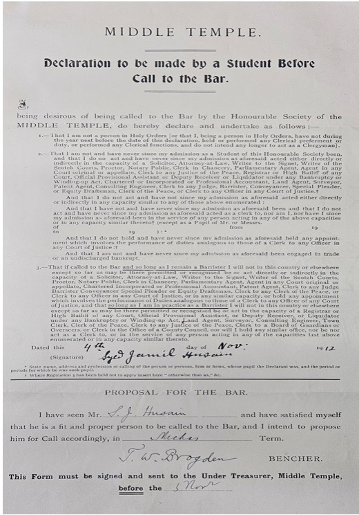 Declaration by Jamil Hussain upon his call to the bar, 1912